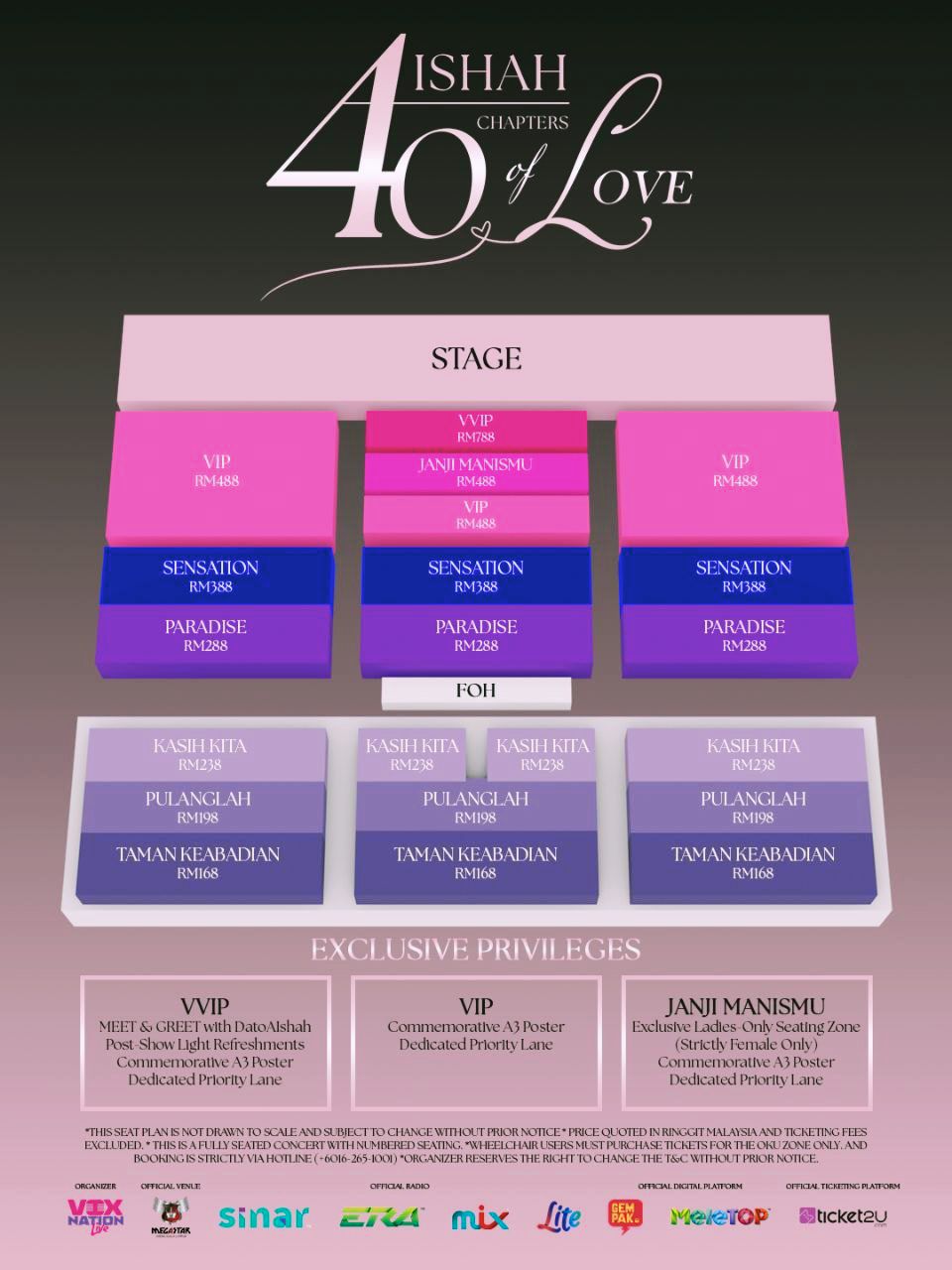 Tiket bagi konsert “Aishah 40 Chapters of Love” yang berharga RM788 (VVIP), RM488 (VIP), RM488 (Janji Manismu), RM388 (Sensation), RM288 (Paradise), RM238 (Kasih Kita), RM198 (Pulanglah) dan RM168 (Taman Keabadian) boleh dibeli mulai 3 petang, 17 April 2026, di laman web www.ticket2u.com.my/Aishah40